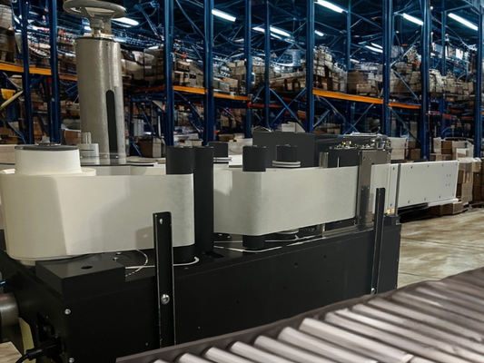 A packaging systems integrator required a pallet labeling system for a new palletizing line they were installing. The end-user wanted to be able to wrap a long label around the corner of the pallet after it was stretch-wrapped, so that pallet information could be read on adjacent sides.